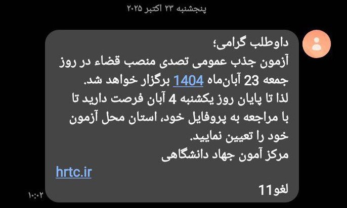 ثبت‌نام متقاضیان تصدی منصب قضاء ۱۴۰۴ در شهریورماه سال جاری از طریق درگاه رسمی مرکز آزمون جهاد دانشگاهی انجام شد. طبق اطلاعیه ثبت‌نام، این آزمون برای تمام داوطلبان اعم از دانشگاهی و حوزوی در نیمه دوم آبان‌ماه برگزار می‌شود.